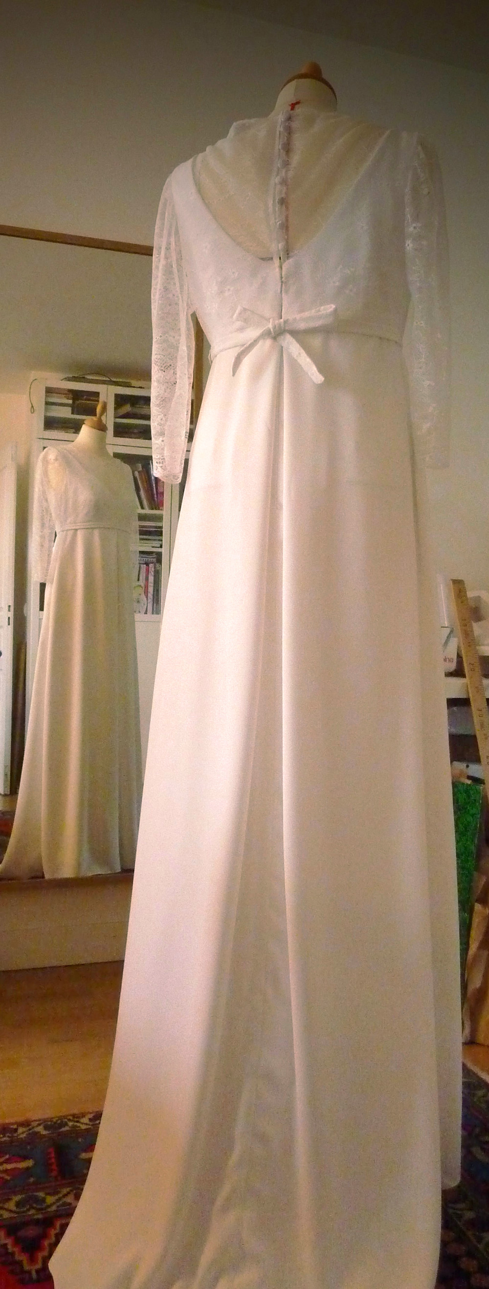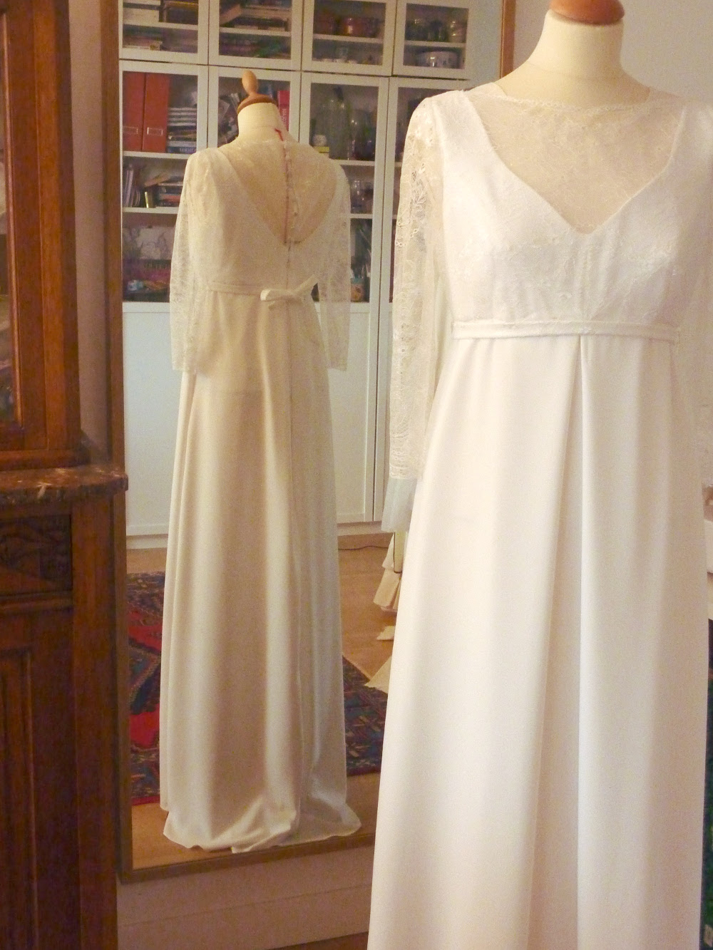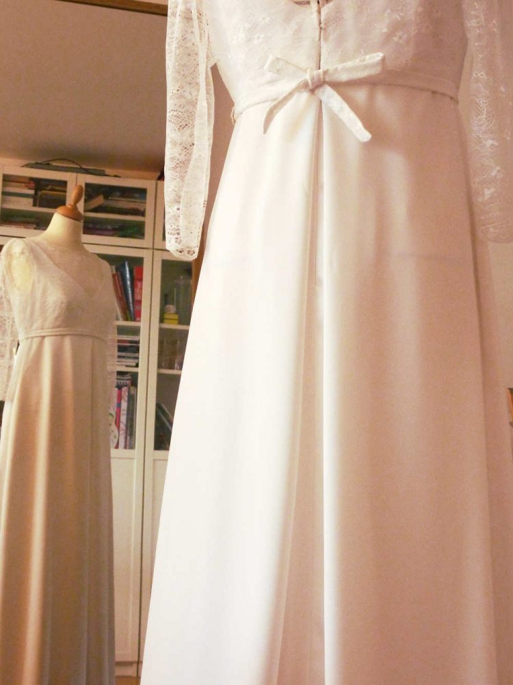 Robe de mariée en crêpe à taille empire avec petite traîne, manches et haut en dentelle chantilly. La taille est soulignée par une ceinture fine en crêpe recouverte de dentelle. Cette robe a été créée sur mesure pour une mariée enceinte.