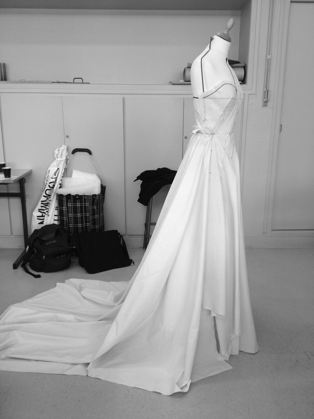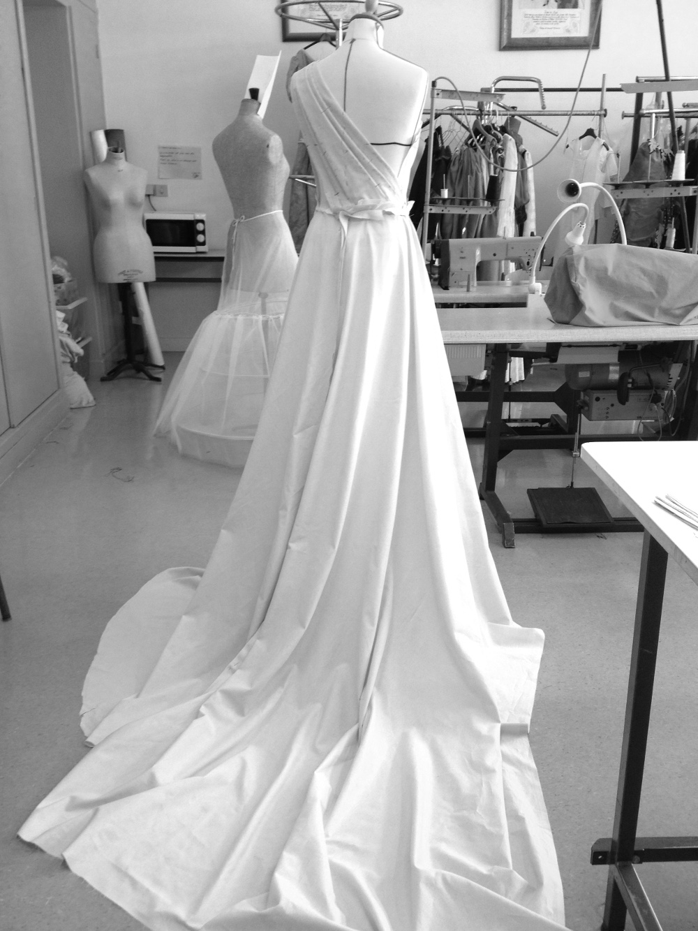 Ci-dessous 3 photos d’une robe drapée à traîne, à réaliser en satin duchesse.