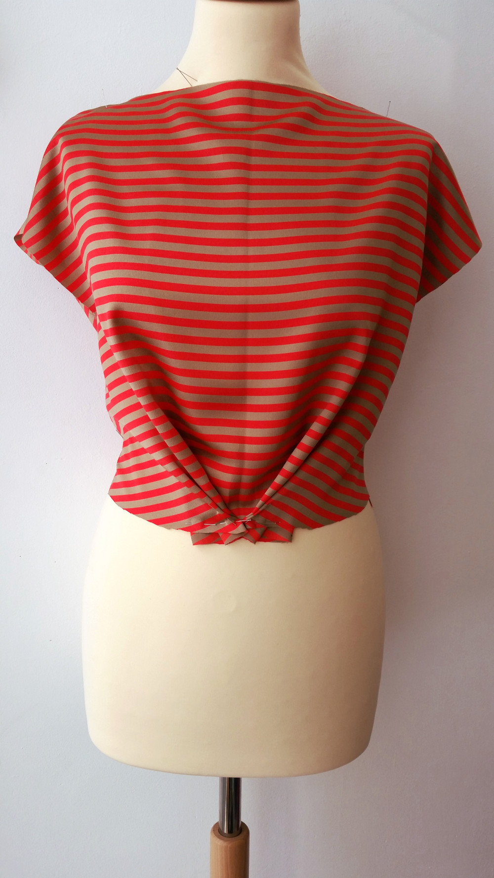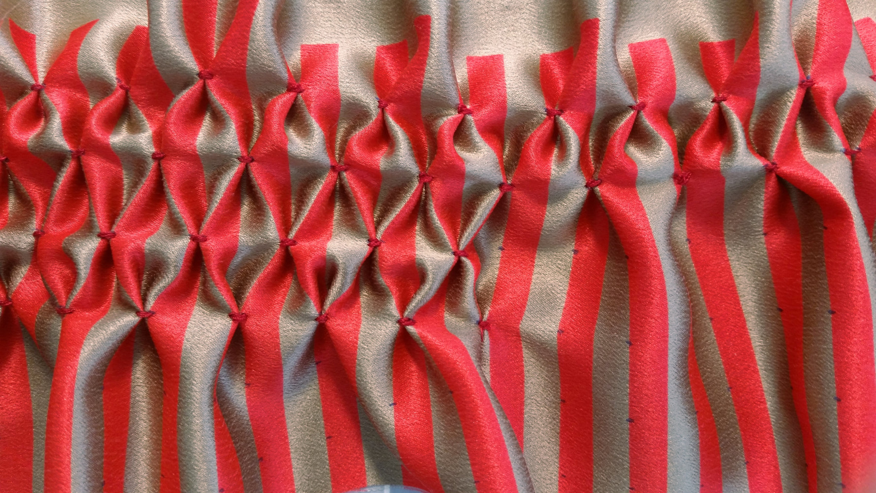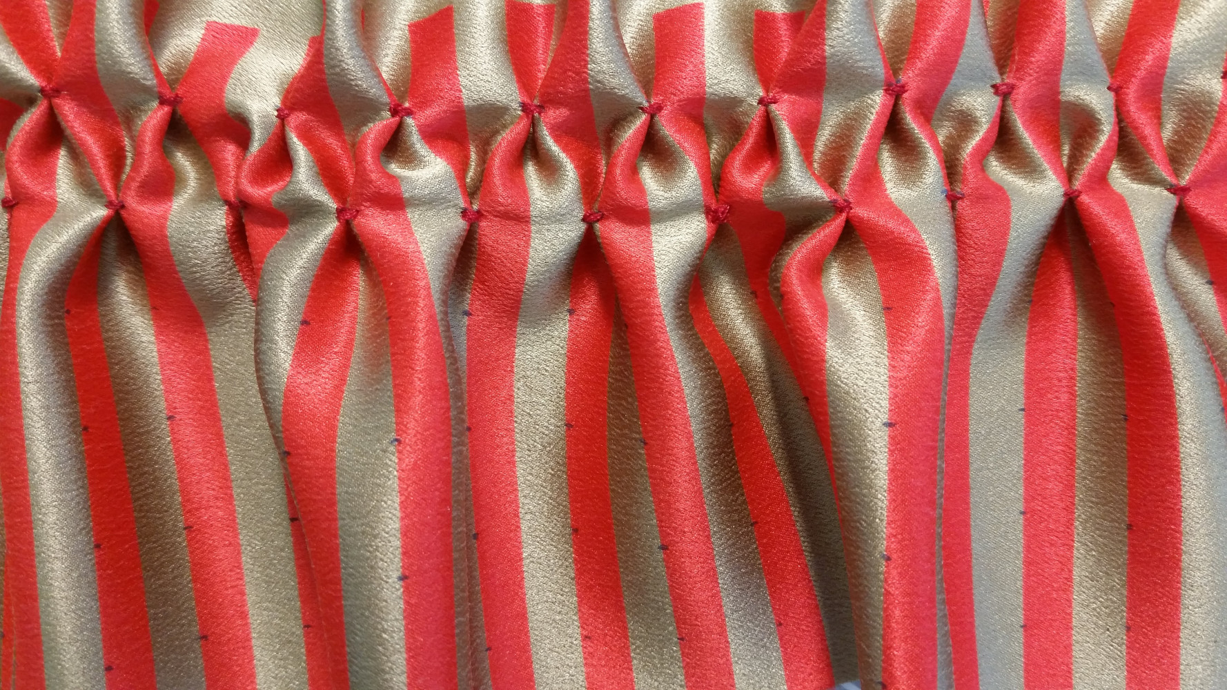 Quelques éléments d’une création en cours pour la St Valentin… Un tissu satin de soie corail et or, un travail de plissage à l’aiguille… A suivre!
