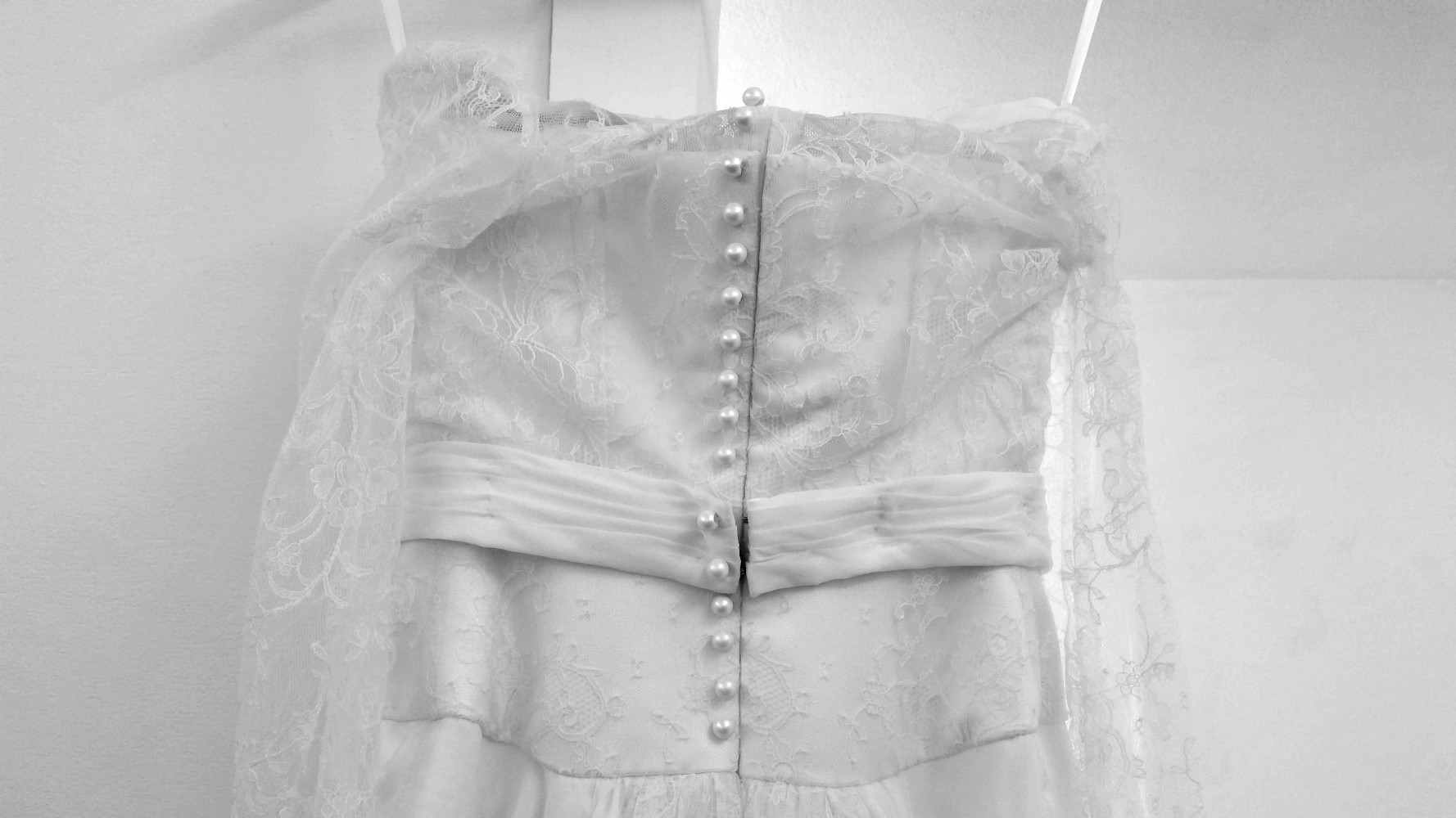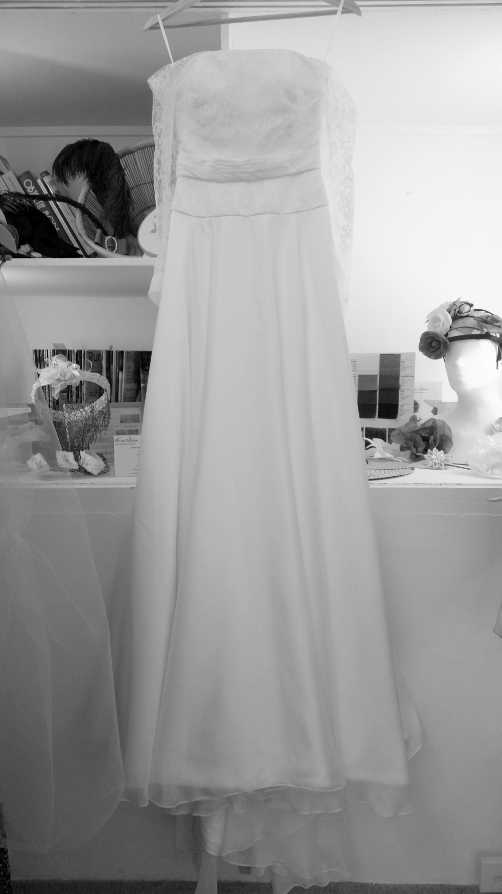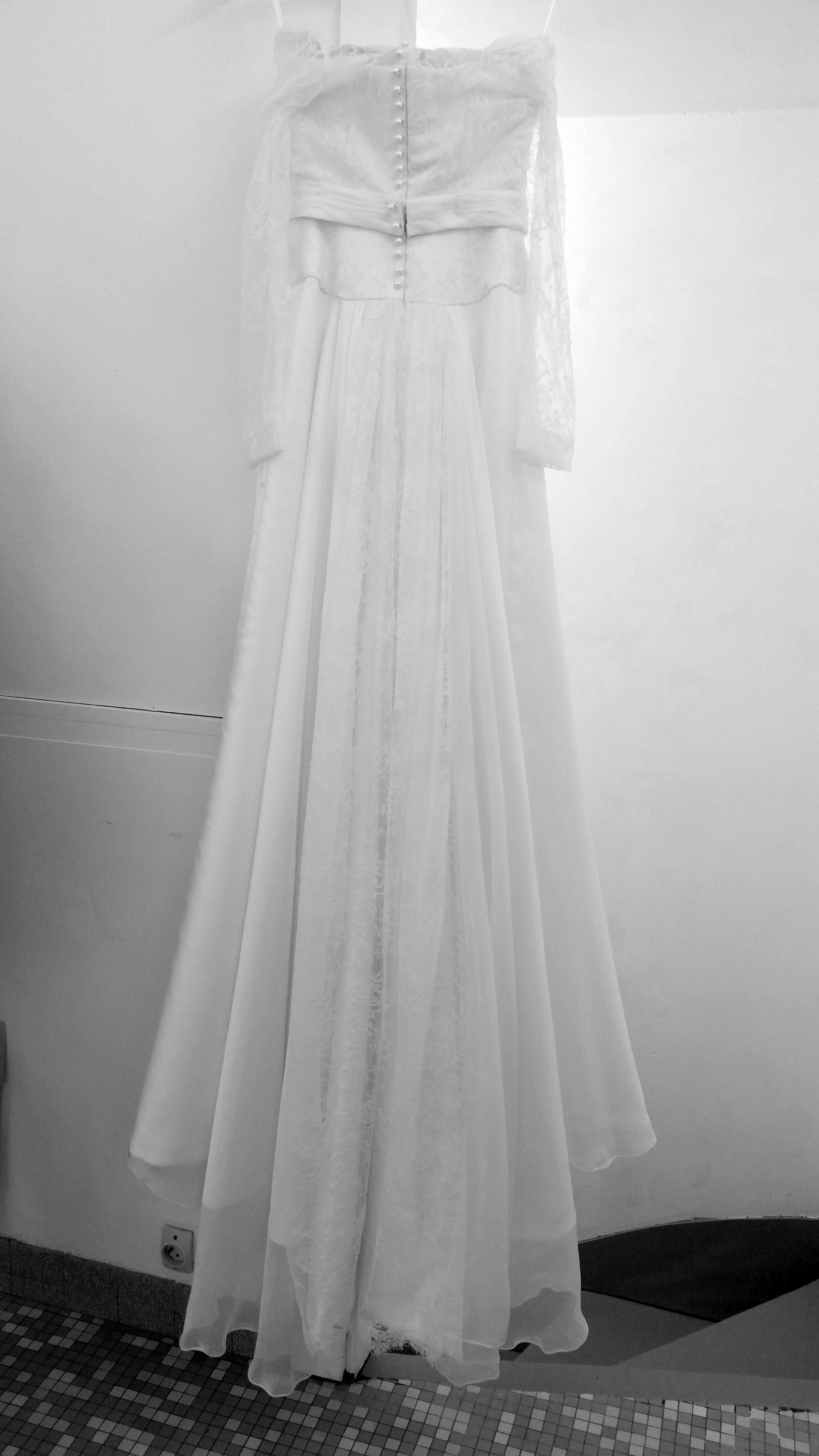 Pour ce mariage de fin d’automne, la mariée a choisi une robe à volume sur la base d’un bustier et d’une jupe à traîne, coupés en satin duchesse. La jupe a été recouverte d’une délicate mousseline de soie qui orne également la ceinture. Le buste est enveloppé dans une pièce à manches en dentelle de Calais qui descend sous la taille ; cette dentelle vient également garnir toute la longueur de la traîne au milieu dos.
