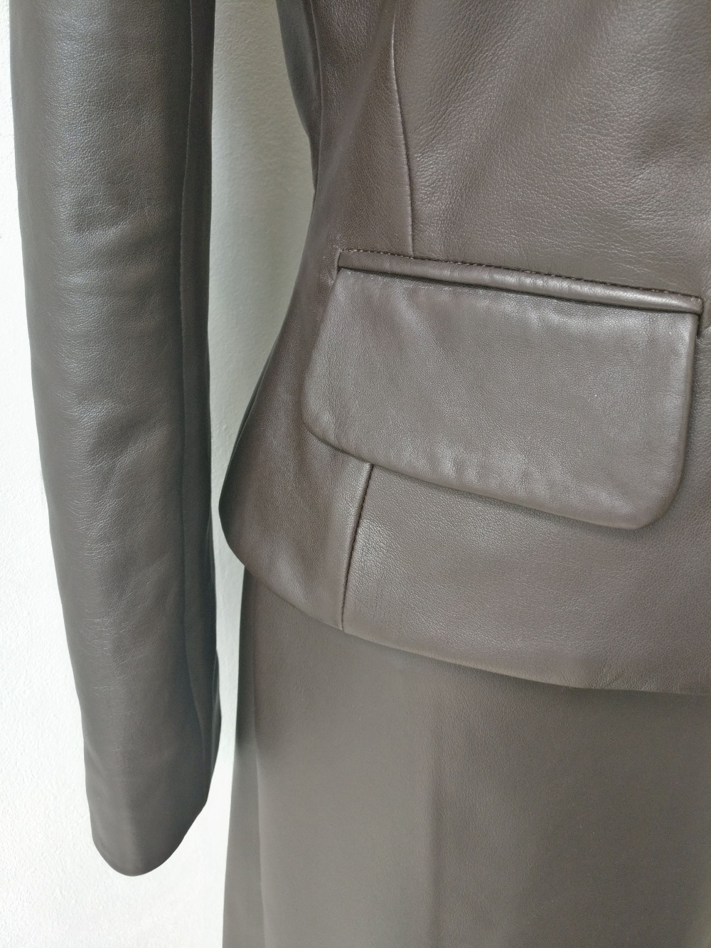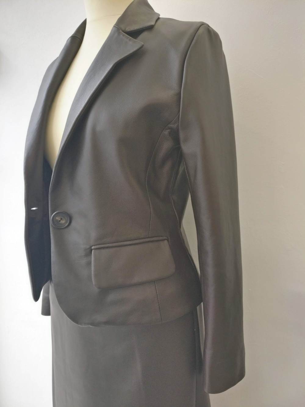 Pour ma deuxième formation en couture du cuir, j’ai réalisé cette veste tailleur cintrée à courtes basques, d’après un patron que j’ai conçu aux mesures. Elle est en agneau souple et fin de couleur chocolat. Elle est fermée par un bouton et sa boutonnière passepoilée, sous un décolleté à col cranté et comporte des manches tailleur classiques. Deux poches à rabats se logent sous la taille.