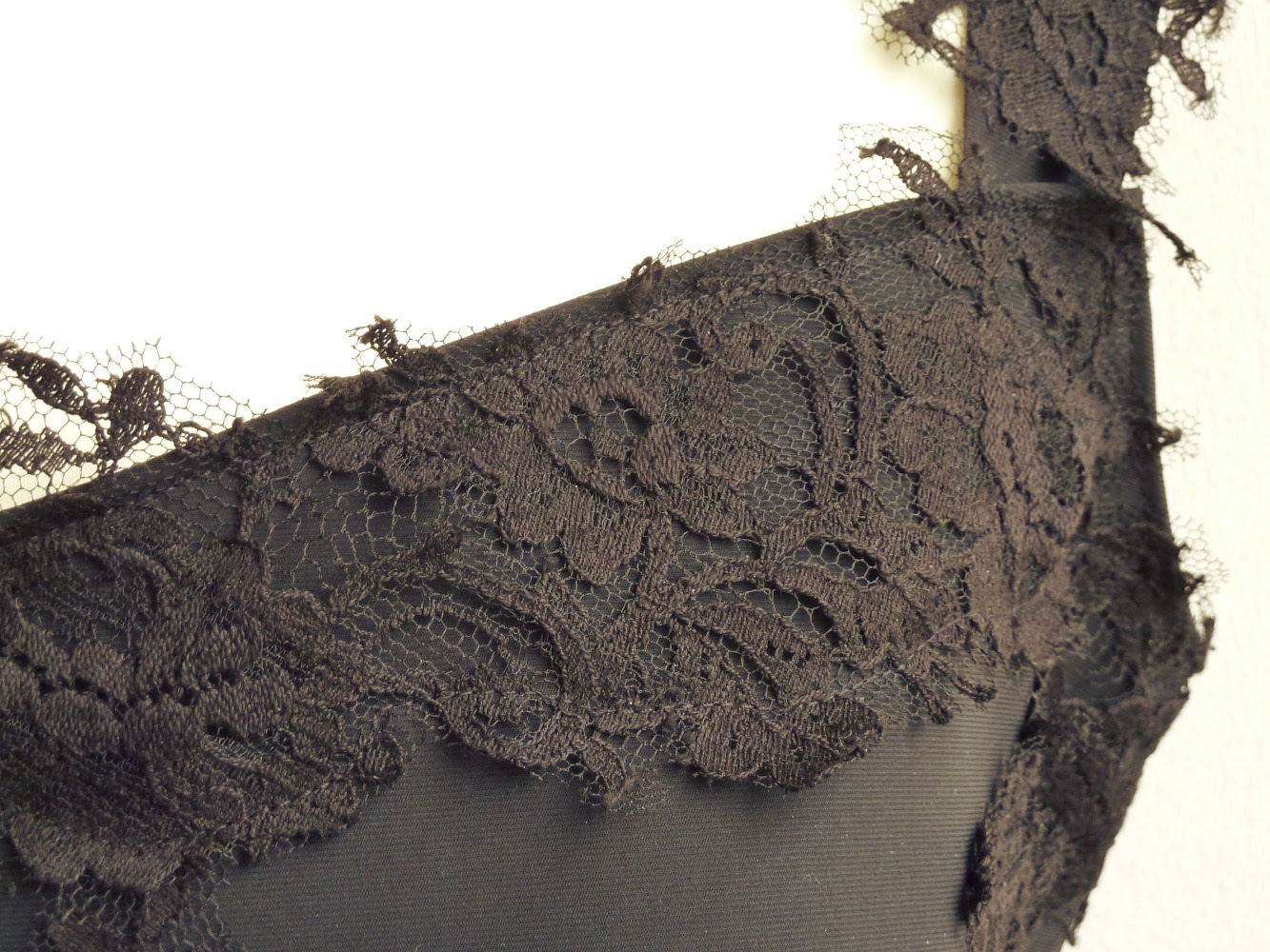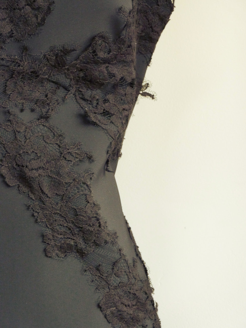 Beaucoup de douceur pour cette robe fourreau longue en crêpe satin de soie bleu clair, rehaussée par un corsage en dentelle de Calais chantilly ; robe entièrement doublée comme toutes les tenues, manches 3/4 en dentelle uniquement.