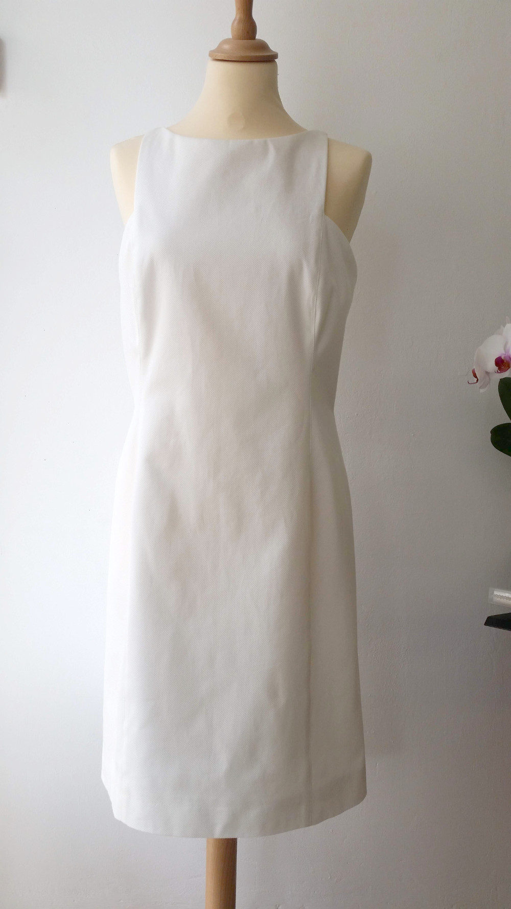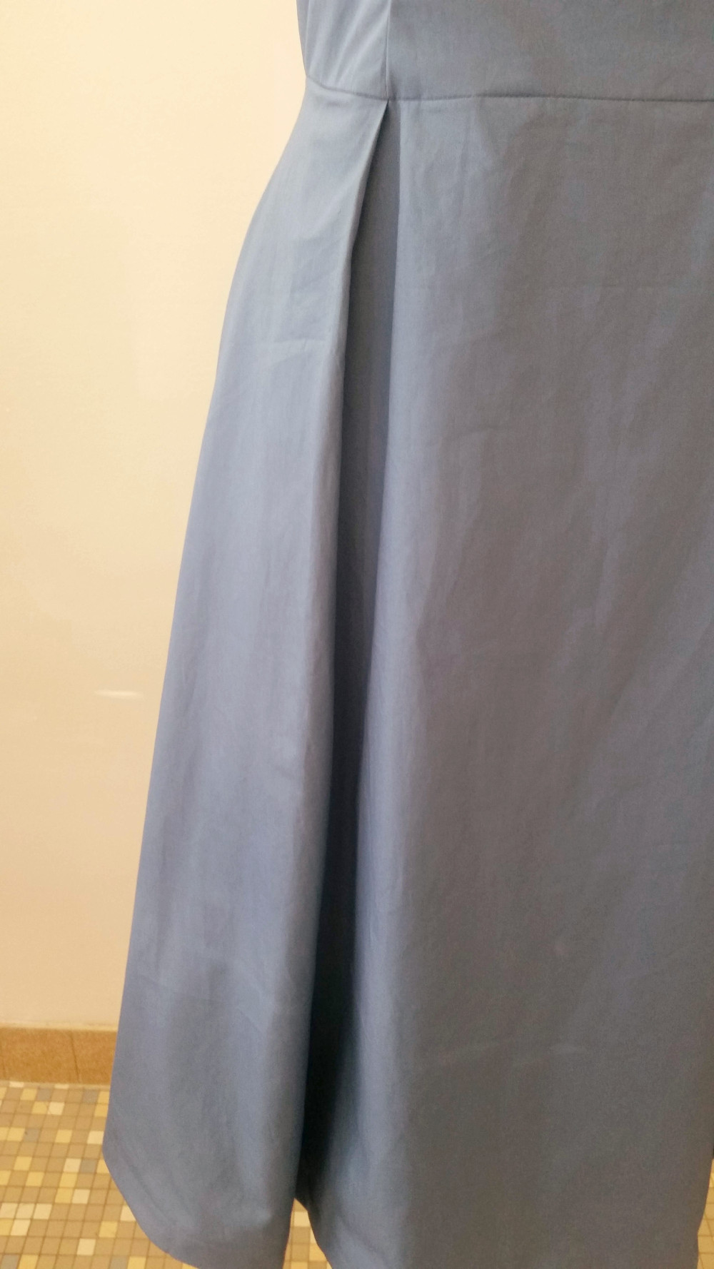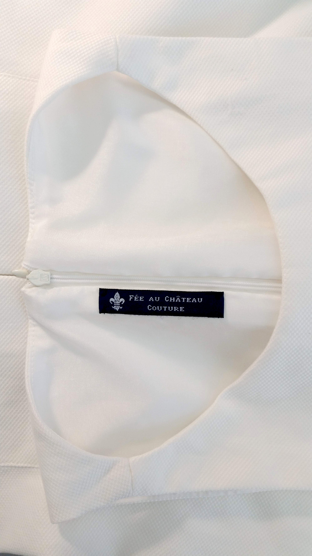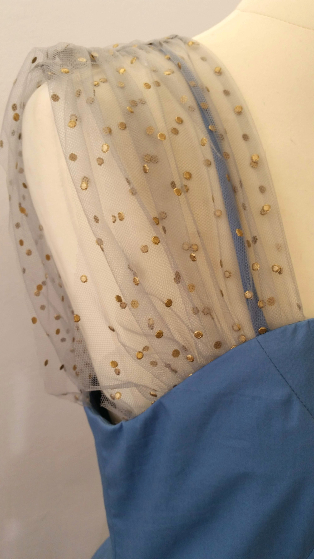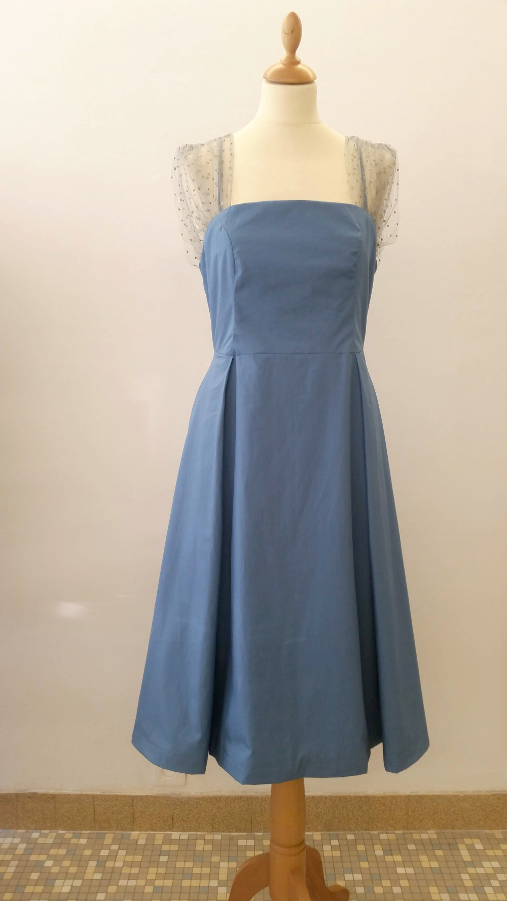 En plus des robes en soie, Fée au château crée aussi des robes en cuir et laine sur-mesure, comme celle-ci qui associe un cuir agneau noir et une laine tweed à motif noir et bleu.
