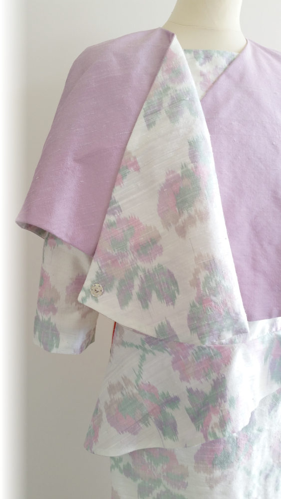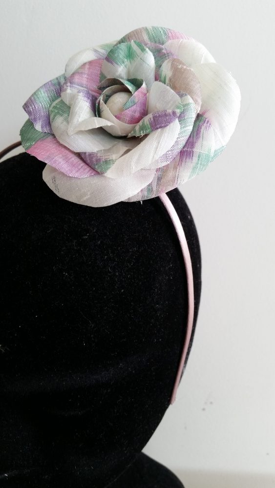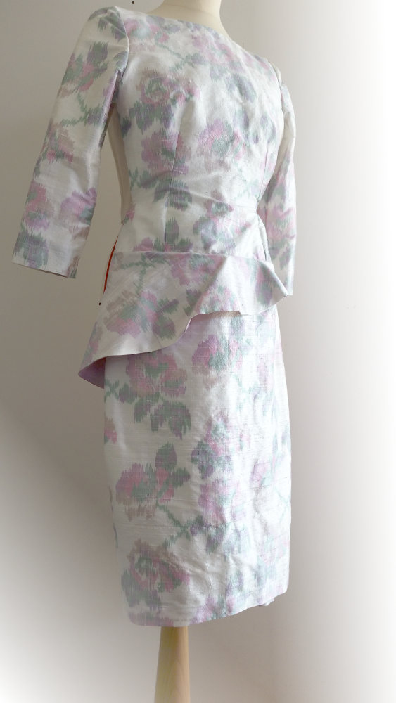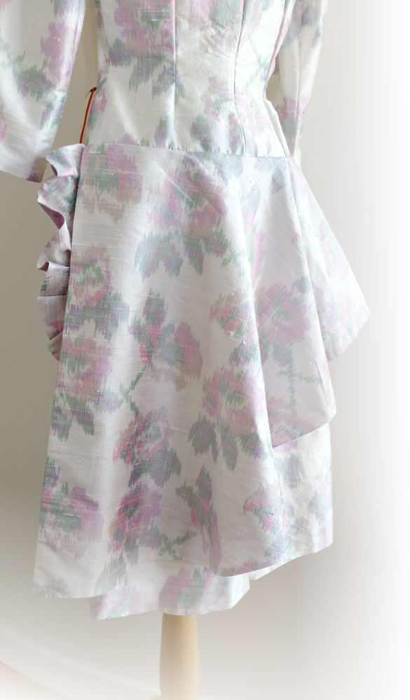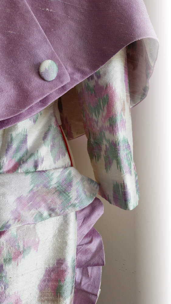 Coupés dans le tissu de la robe pour la touche de raffinement finale, la pochette avec son anse en passementerie, et la fleur en tissu posée sur un bibi noir.