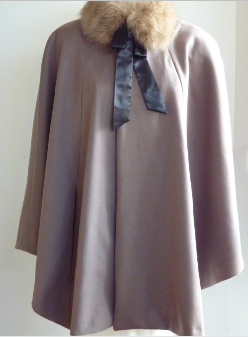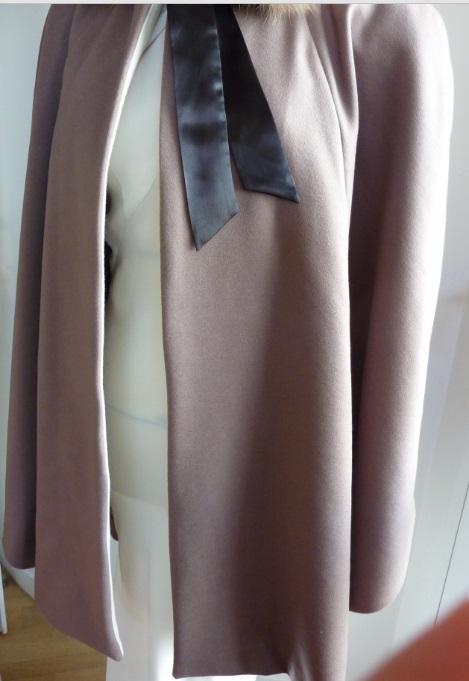 La cape est de toutes les occasions! Ici une cape réalisée pour une mariée en cachemire avec une parementure en laine de couleur beige. Elle possède un col rond et des poches pour le passage des mains.