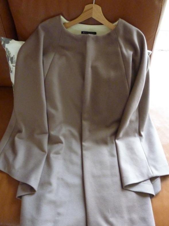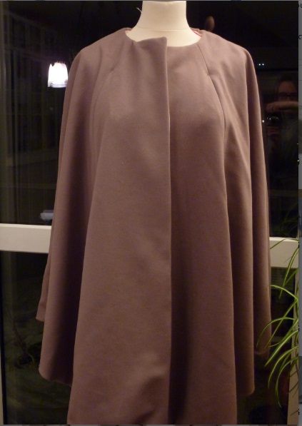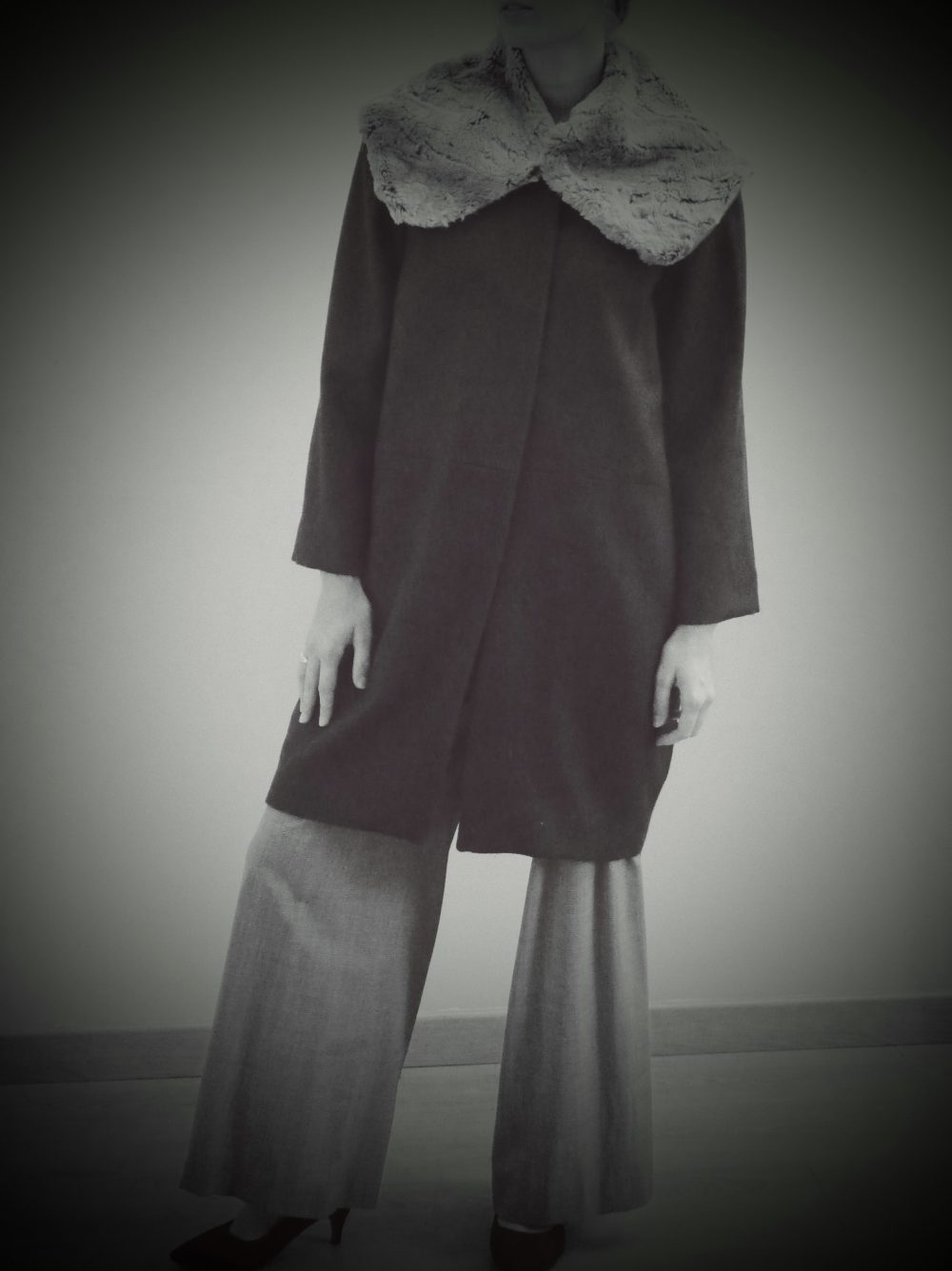 Manteau en lainage à chevrons et col amovible en fausse fourrure, ligne cocon avec emmanchures descendues et buste non cintré en forme de « cocon ». Les boutons ne sont pas apparents et sont des pressions.