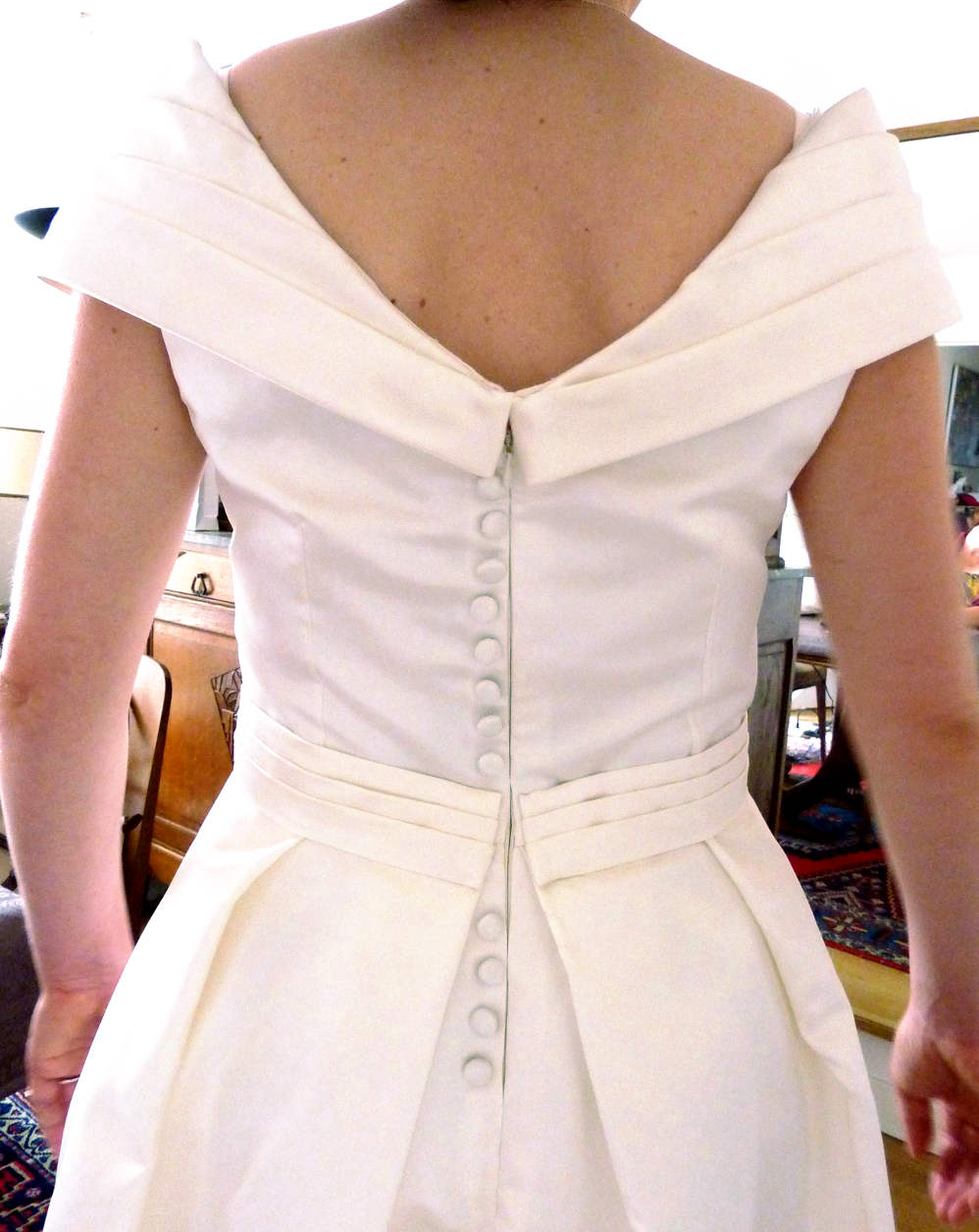 Robe de mariée à traîne réalisée sur mesure en satin duchesse composée d’un buste drapé sur les épaules et d’une jupe mise en volume par un jupon, finie par une traîne arrondie au dos. Une allure princière, agrémentée par un bouton de rose en soie façonnée à la main.