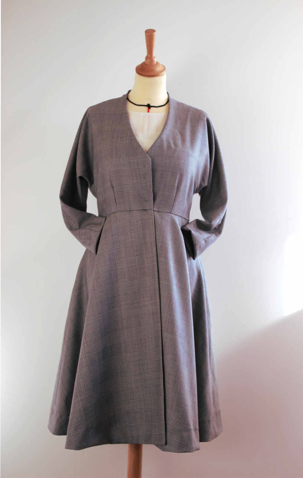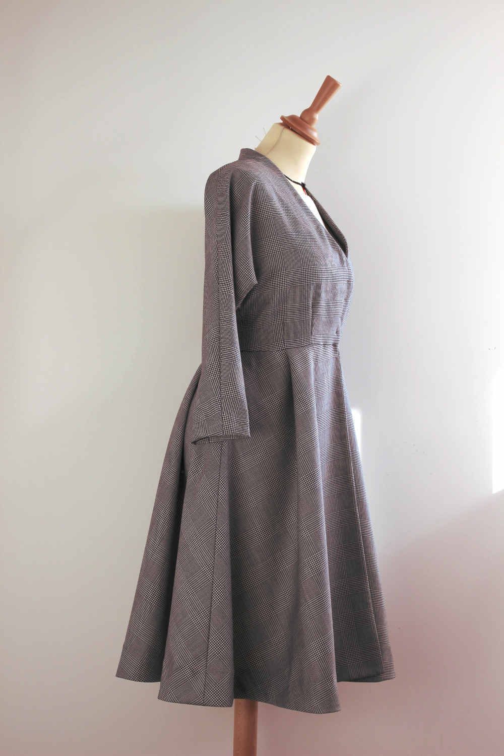Voici une robe manteau en 100 % laine Prince de Galles qui est idéale pour cette demi-saison! La coupe des manches longues est kimono, le buste est ajusté, il se prolonge sur une jupe de robe évasée à 4 plis couchés au dos et devant. La fermeture est dissimulée et composée de pressions sur le milieu devant.