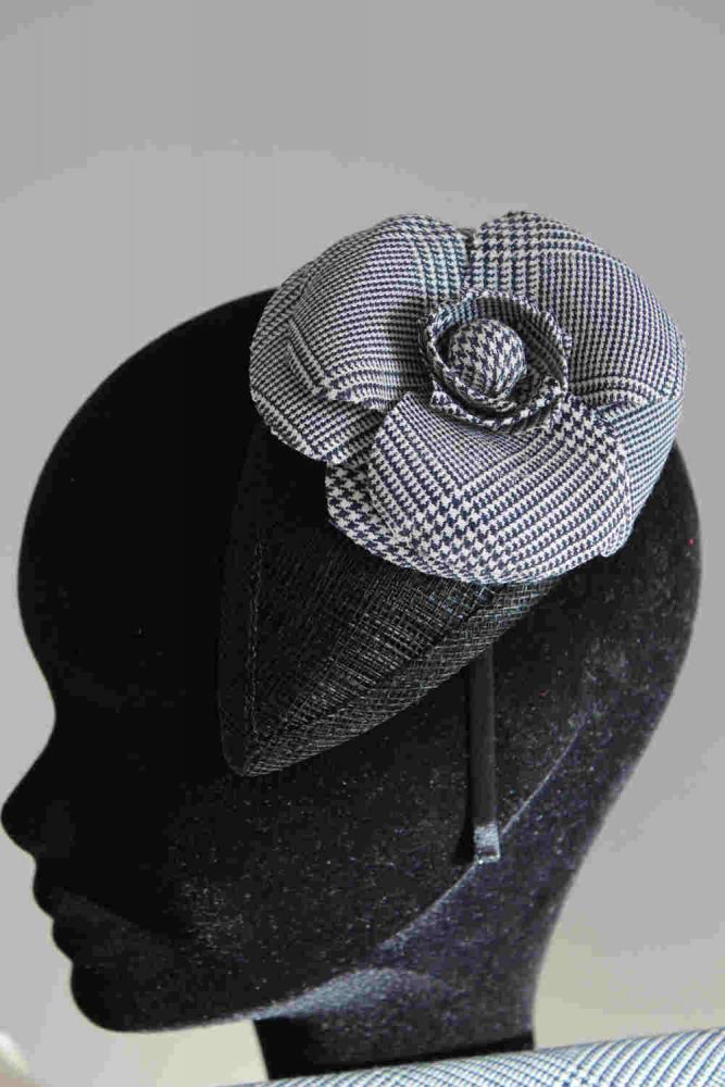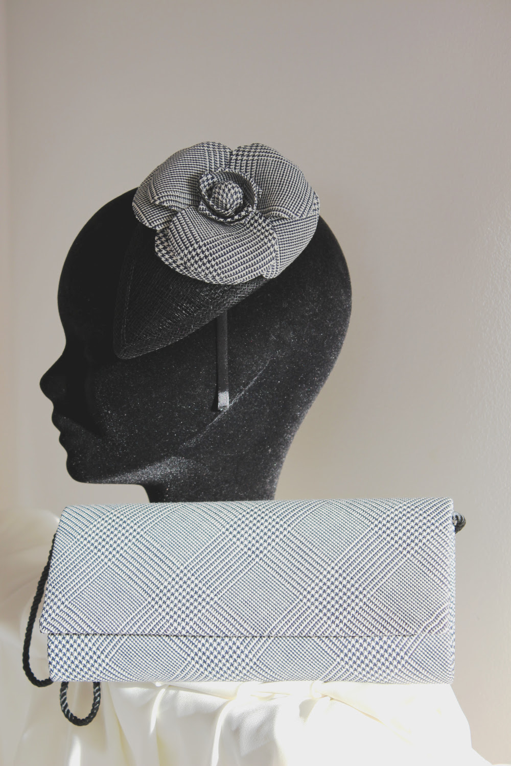 Coupés dans le tissu de la robe pour la touche de raffinement finale, la pochette avec son anse en passementerie, et la fleur en tissu posée sur un bibi noir.
