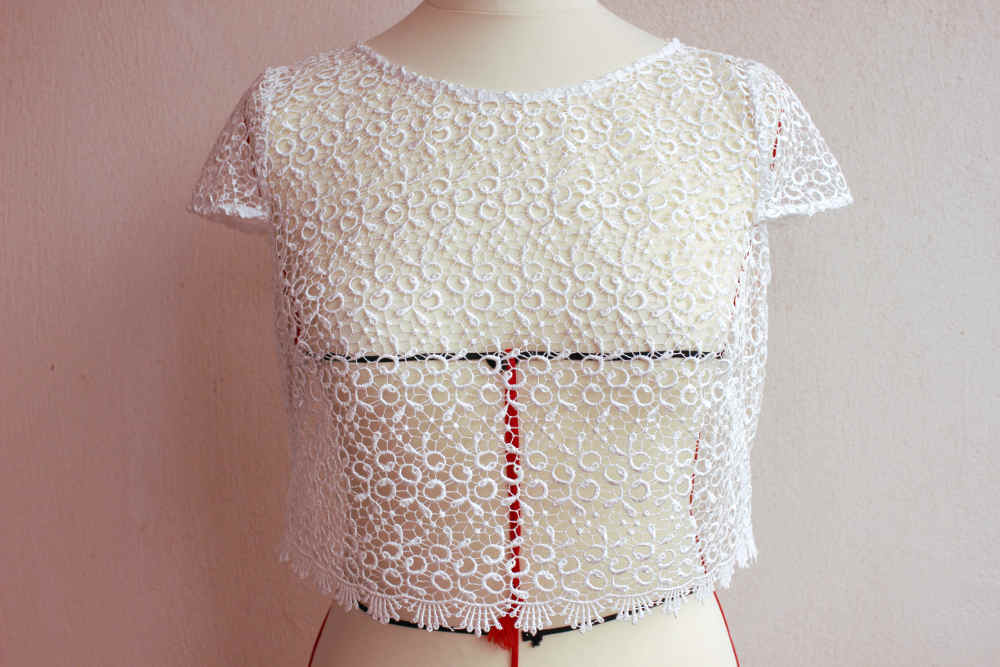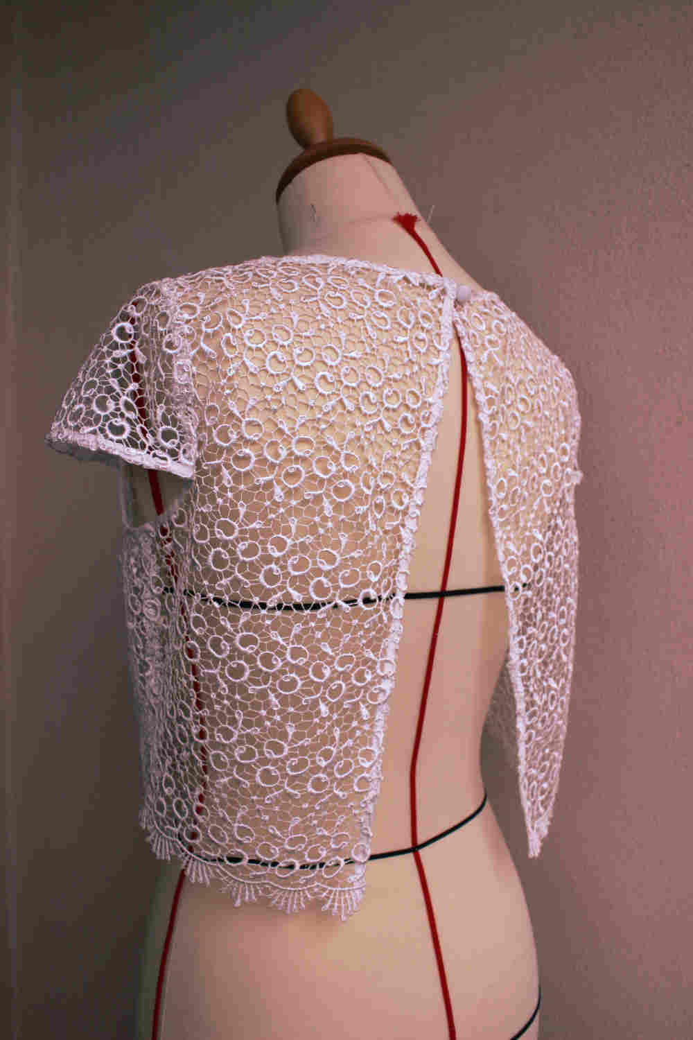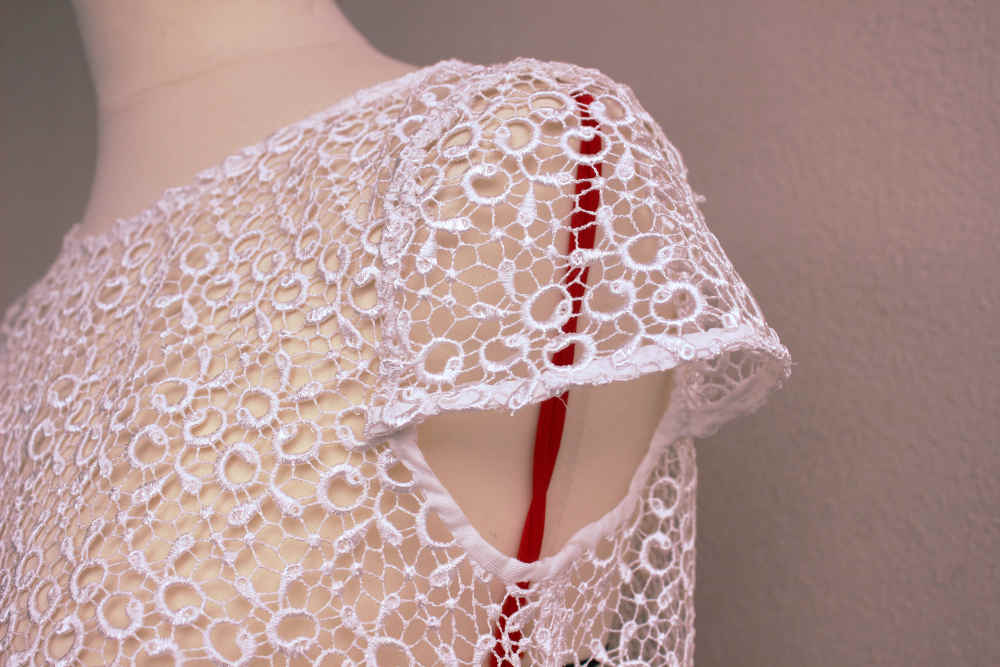 Ce jacquard au joli dessin fleuri adoucit une coupe plutôt rectiligne. Il ennoblit aussi tout de suite la création par la pureté du blanc et la délicatesse du dessin.