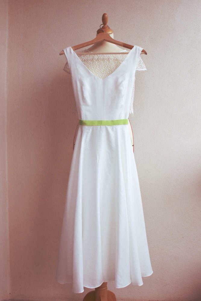 La couture sur mesure c’est aussi habiller la personne au mieux pour magnifier sa silhouette et son apparence. Cette robe fourreau sans manche est un exercice de base pour la couturière. En même temps, ce basique est toujours très élégant pour un mariage, lorsqu’il est coupé sur mesure, et en plus avec une étoffe précieuse.