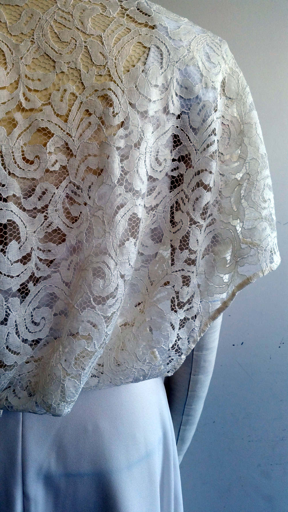 L’histoire de cette création : la cliente souhaitait reproduire la silhouette d’une robe qui avait été portée à un moment clé de l’histoire du couple. Nous avons cherché un tissu qui évoquait vaguement les broderies de cette robe noire. Nous nous sommes aussi inspirée de la coupe, son côté large et confortable en optimisant les volumes par rapport à la silhouette et à l’occasion.