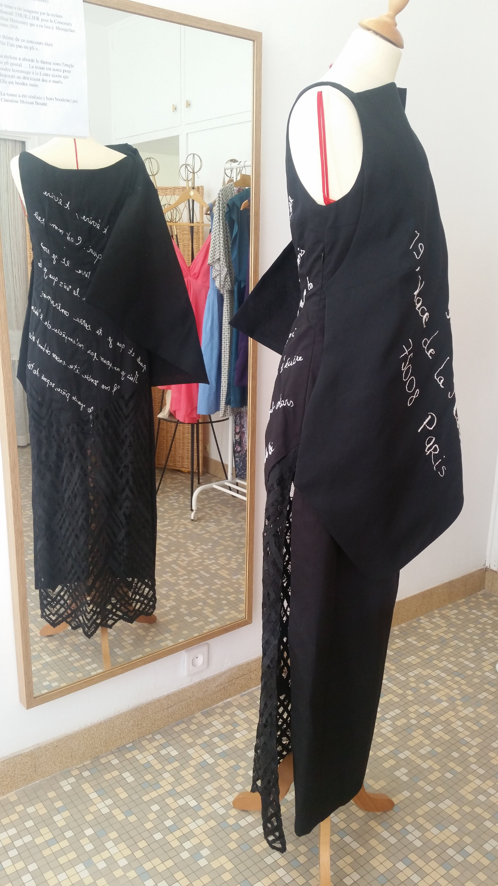 Ensemble bustier et jupe de sirène pour le soir. Cet ensemble qui forme une robe est composé de velours de soie d’un vert changeant comme de la mousse. Il est réveillé par des incrustations de ruchés de pongé de soie jaune citron, au-dessus des hanches et et sous le fessier, puis se terminant en un godet plissé en même soie.