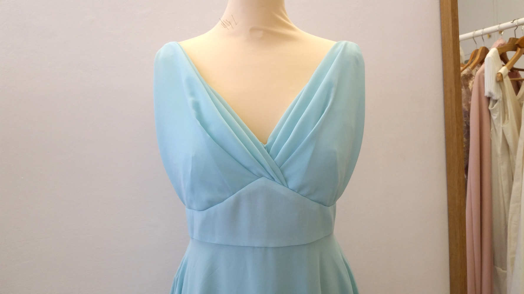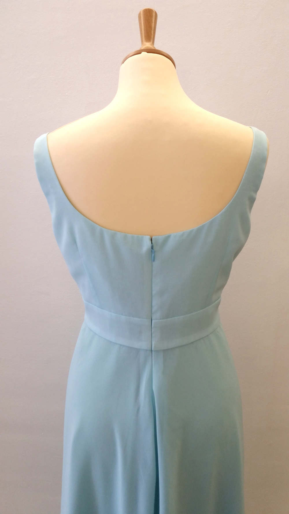 Parmi les créations de Fée au Château exposées, nous profitons de dévoiler cette robe empire en mousseline de soie, de couleur vert d’eau, drapée sur le buste et au dos. Elle est ornée de boutons de roses façonnés dans cette mousseline.