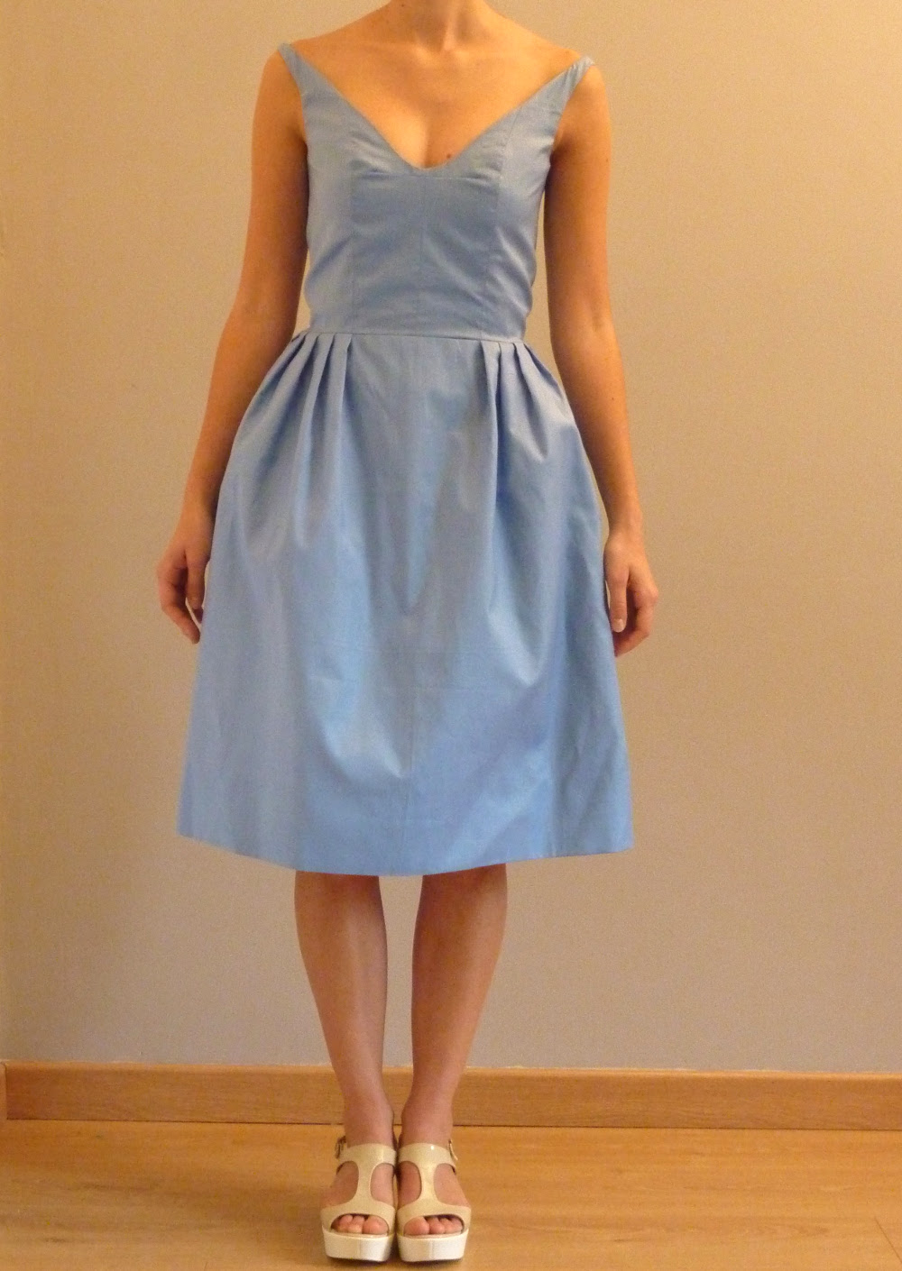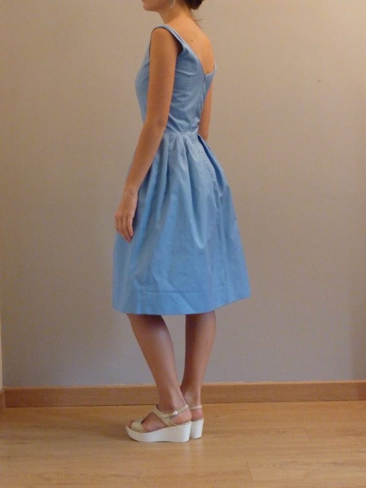 Ci-dessous, une allure vintage résolument héritée des années 50! Robe en coton découpe princesse à décolleté en V dos et devant ; jupe mise en volume grâce à des plis à la taille pour souligner une taille fine. Robe entièrement doublée.