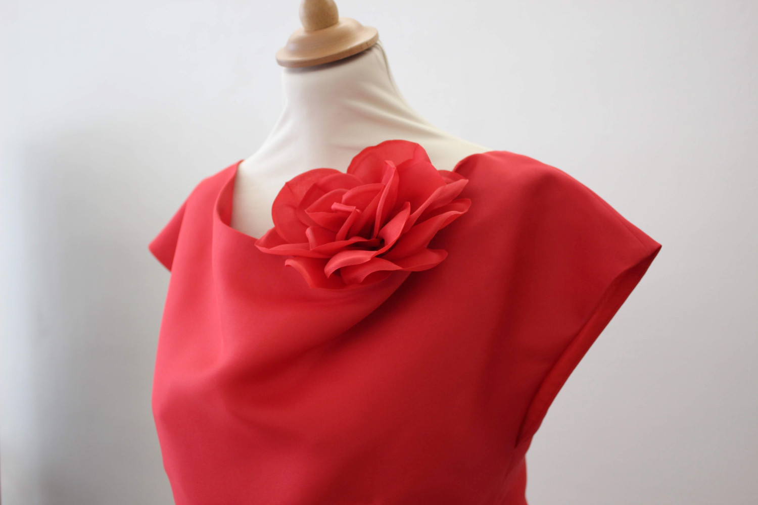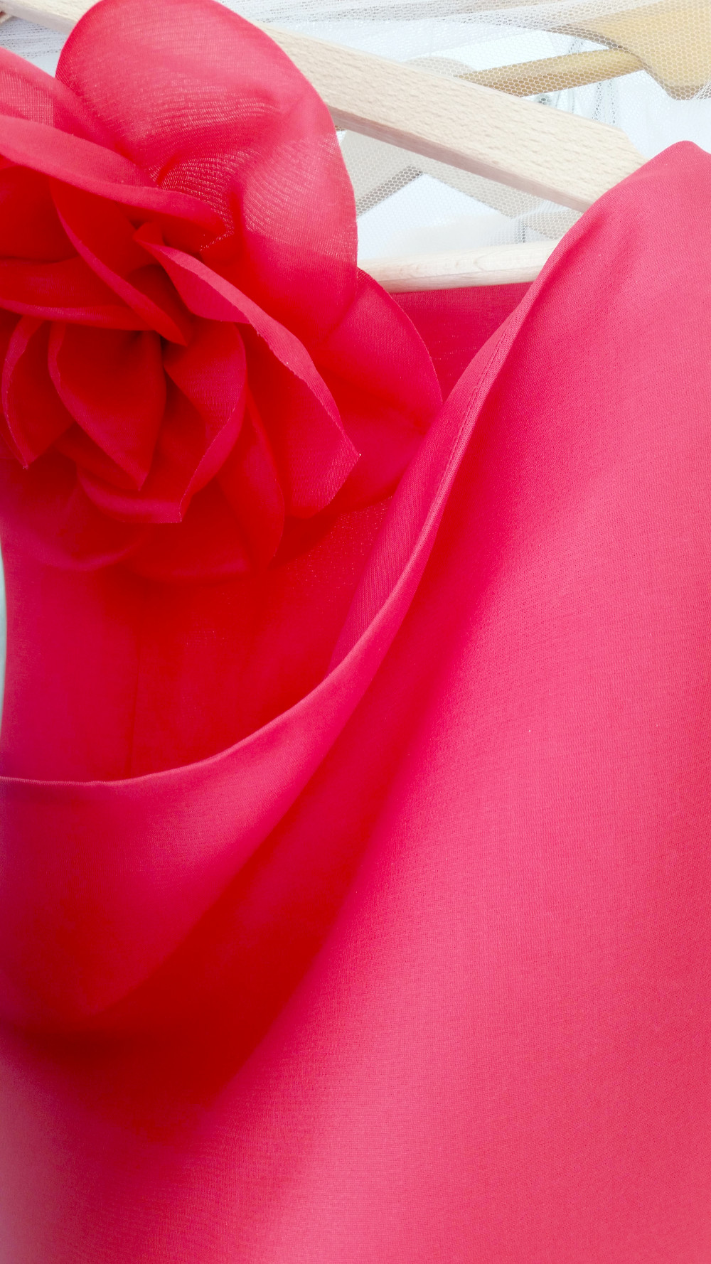 une robe à la Polonaise en soie sauvage jaune et jupon rouge, décoré par des ruchés en même soie, des roses en soie également façonnée par Fée au Château ;