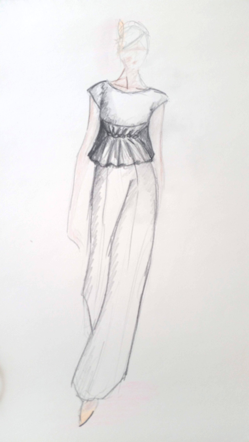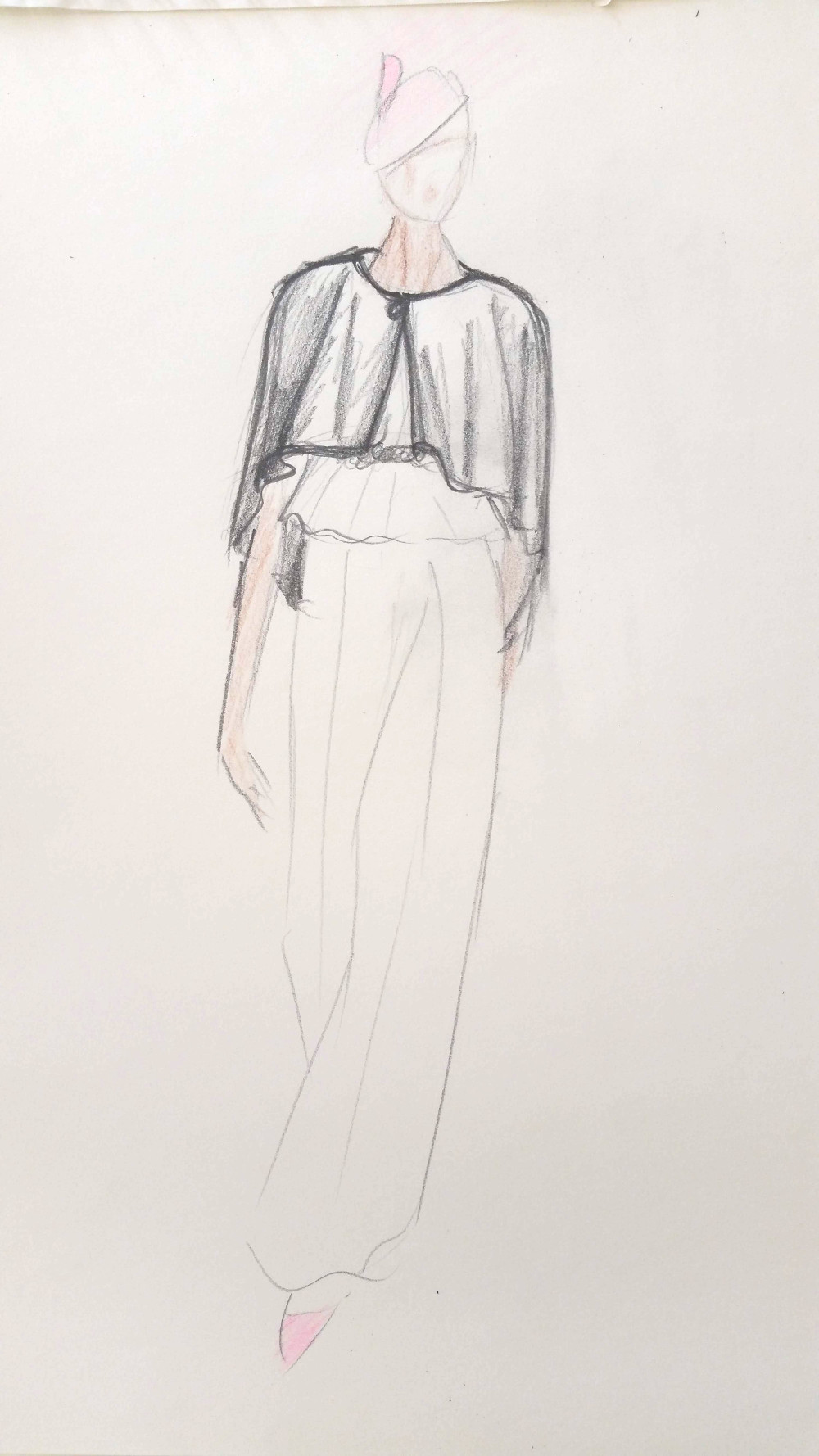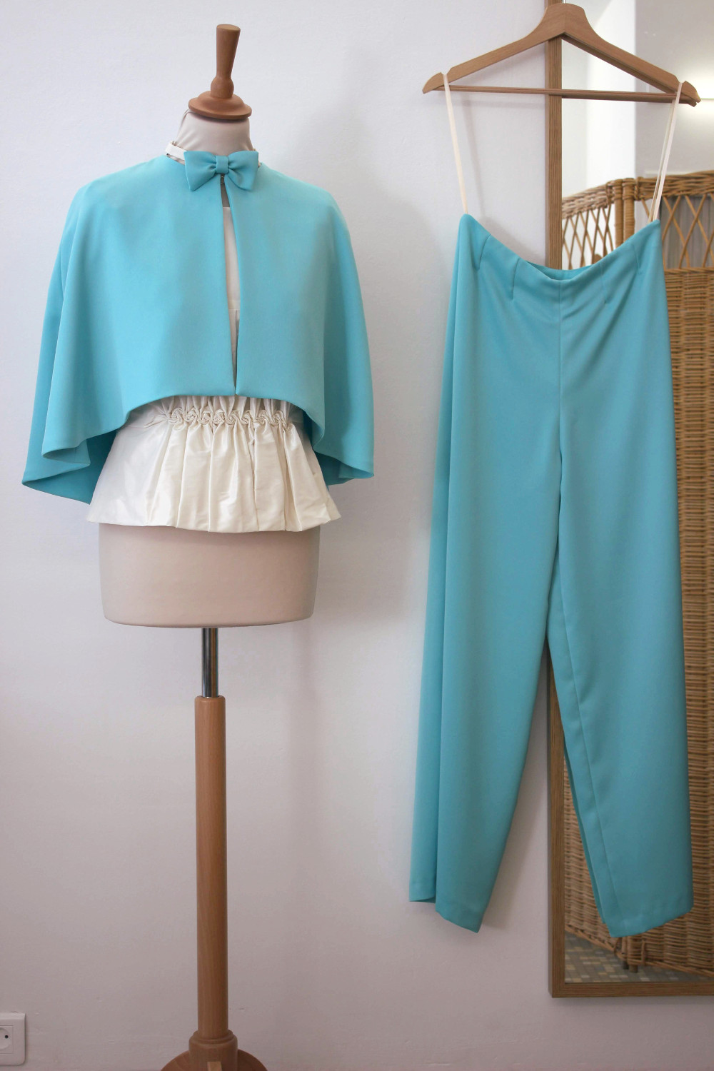 Cette tenue est composée d’un top porté sur un pantalon large et recouvert d’une capeline. La capeline et le pantalon sont réalisés en crêpe envers satin.