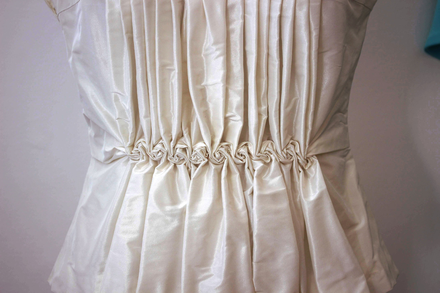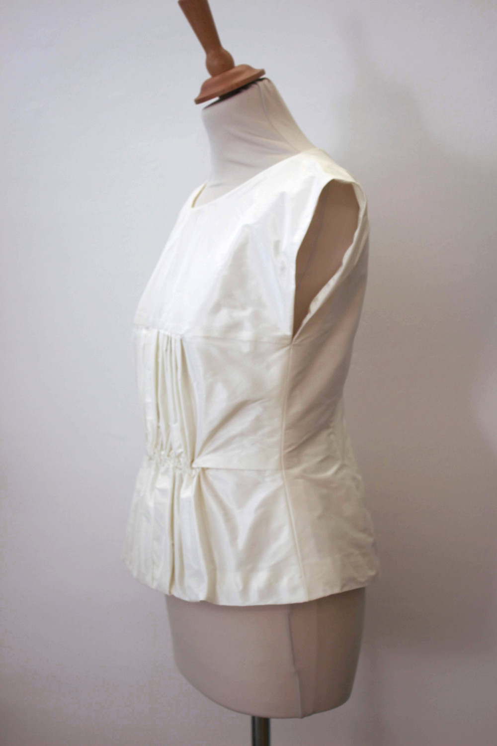 Le top est coupé dans un taffetas écru et est plissé avec ce motif de vagues sur le devant.