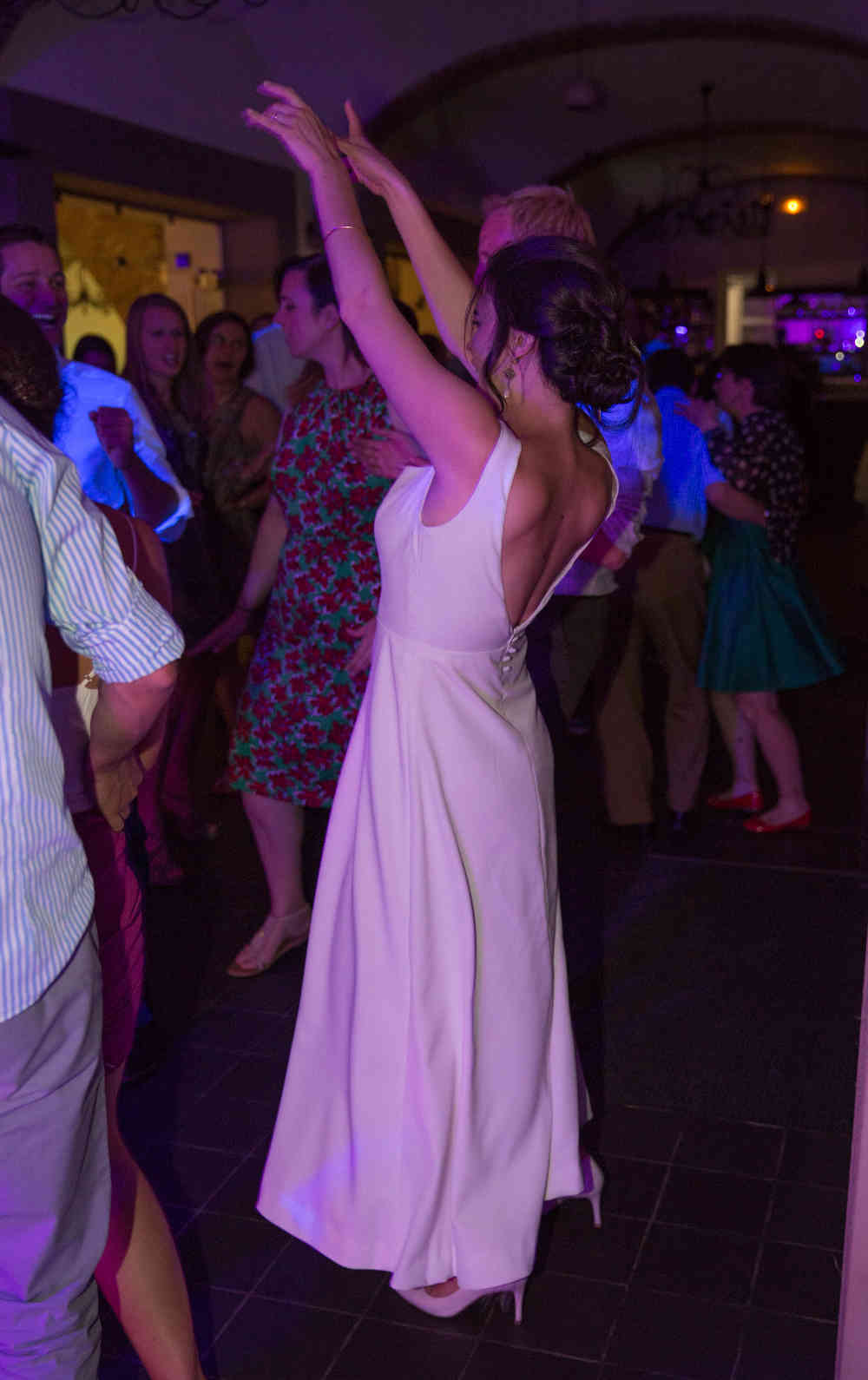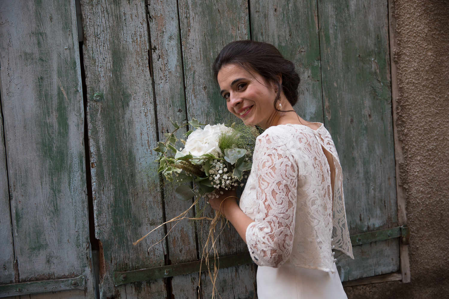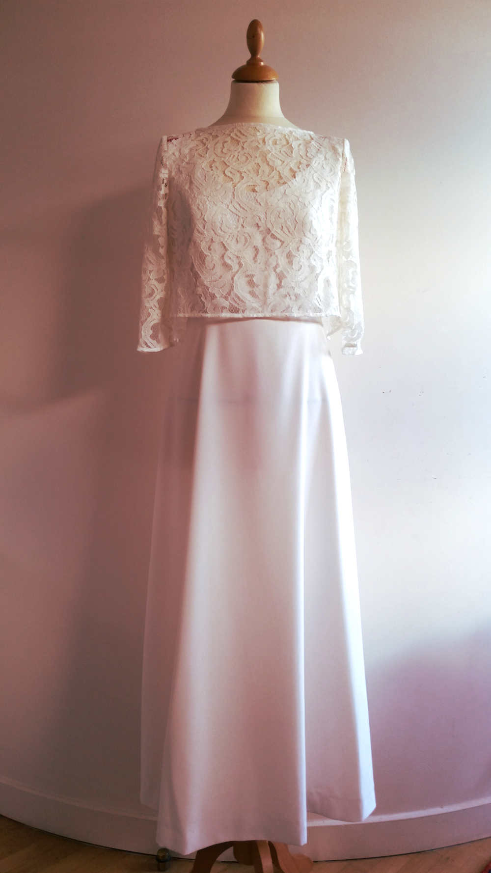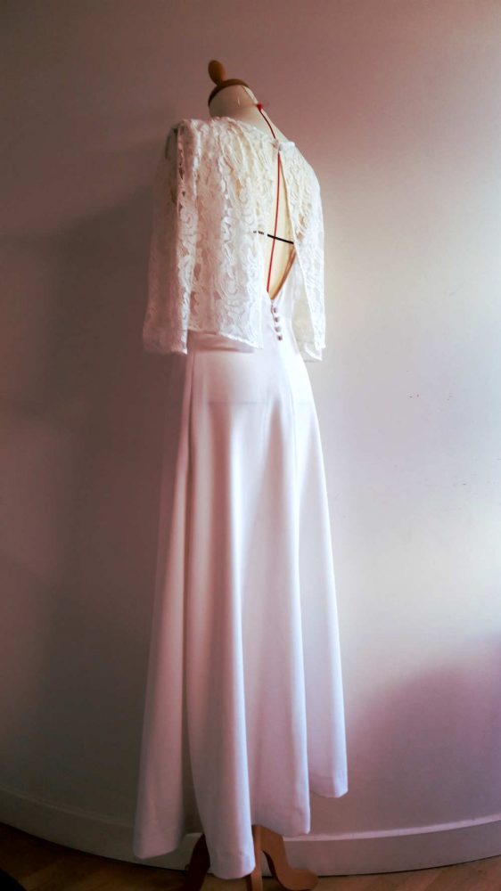 Cette robe en crêpe, réalisée sur mesure par Fée au Château, a un décolleté devant rond, et est ornée d’un haut en dentelle fermé au dos par un seul bouton ; ce qui laisse ainsi entrevoir le dos de la robe!